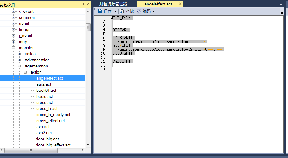 - pvfUtility工具打开你的PVF,打开之后依次展开passiveobject-actionobject-monster-monster-action 然后双击angeleffect.act文件